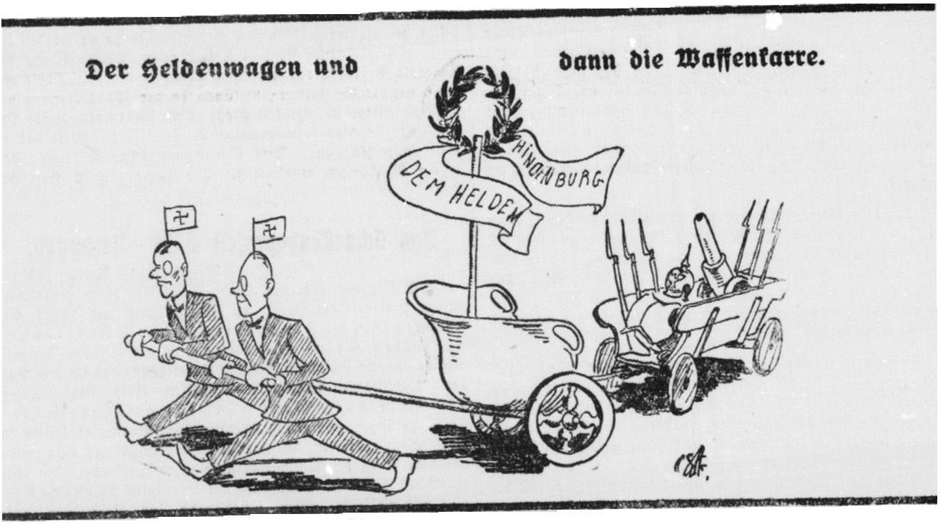 Artikel 48 RV in der Lage, zeitweise wie ein Diktator zu schalten. Das erheischt einen politisch erfahrenen, selbständigen Mann in der Vollkraft der Jahre. Sonst regieren günstigenfalls die Parteien, schlimmstenfalls unverantwortliche Hintermänner. Keine Ehrfurcht kann nun verhüllen, daß Hindenburg nicht mehr vollkräftig ist. Und politische Erfahrung hat er nie beansprucht. ... Wer politisch nüchtern denkt und nicht gefühlsmäßig, läßt sich durch den Namen Hindenburg nicht blenden. Er weiß, diese Wahl bedeutet Schwarz-weiß-rot, Herrschaft der Unglückspolitiker des Vorkriegs (vielleicht Bülow, Tirpitz), Vorarbeit für die Hohenzollern. ... Deshalb heißt unsere Losung Marx! Dessen Wähler lehnen aber von vornherein aufs allerschärfste den Verdacht ab, keine guten und nationalen Deutschen zu sein. Das Vaterland steht ihnen selbst über Hindenburg."